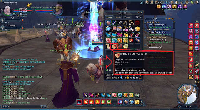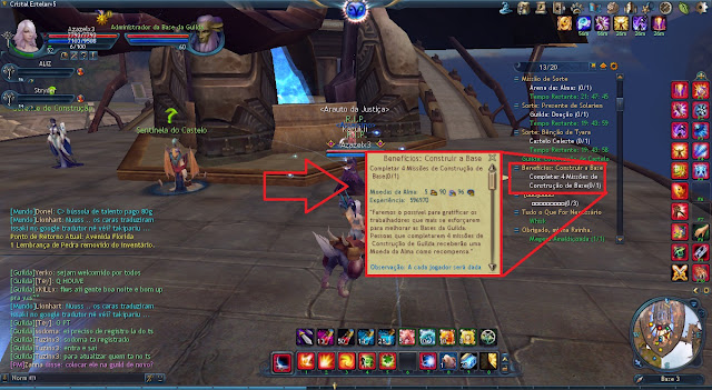 Primeiramente para começar a quest da Base você precisa dos cartões que você recebe com o npc chamado Administrador da Base, nele irão ter 3 missões, sendo uma delas a Doação para a Guilda no qual você doa seu gold para o banco da base, mas são as otras 2 quests que serão importantes, uma delas é a quest chamada “Missões Diárias de Construção” (Img.1) e a outra é “Beneficios: Construir a Base” (Img.2) como mostra as duas prints seguintes: